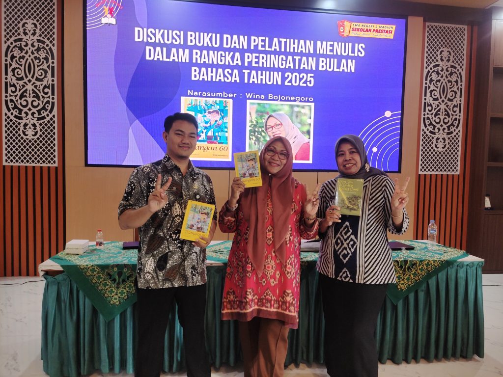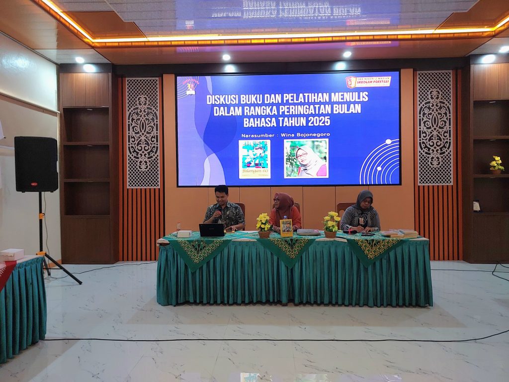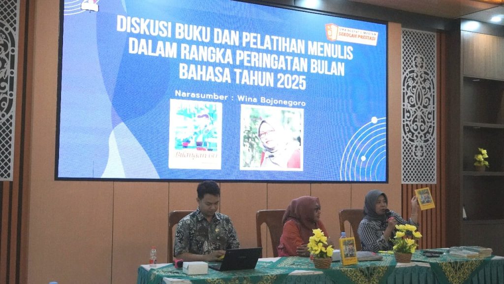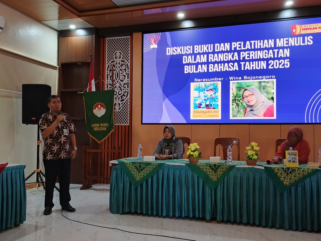 Tim Literasi yang diwadahi dalam ‘Pelita’ pada hari ini, Kamis, 23 Oktober 2025 mengadakan kegiatan Diskusi Buku dan Pelatihan Menulis dalam rangka Peringatan Bulan Bahasa tahun 2025 ini dilaksanakan di Aula. Kegiatan ini diikuti sekitar 48 peserta dengan narasumber Endang Winarti, nama pena Wina Bojonegoro. Kegiatan ini dibuka oleh Waka Kesiswaan Bapak Mashudi, M.Pd. beliau sangat mengapresiasi kegiatan ini dan kegiatan ini selaras dengan yel-yel sekolah satu siswa satu karya, satu siswa satu prestasi. Acara dilanjutkan dengan penyampaian materi inti cara menulis cerpen dan tanya jawab. Peserta sangat antusias mengikuti acara ini dengan memberikan pertanyaan-pertanyaan yang menggugah kita sebagai penulis.