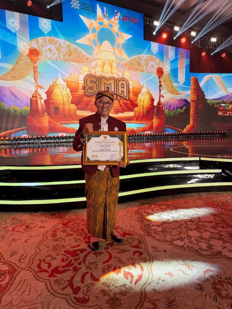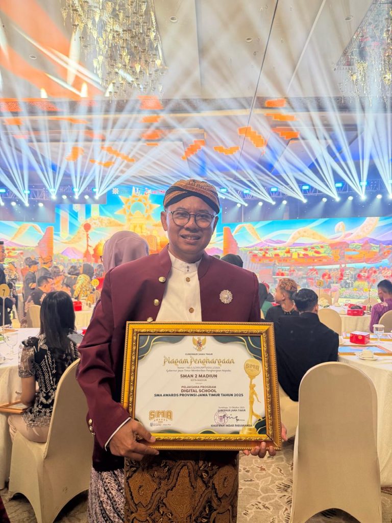 Madiun, 23 Oktober 2025. SMAN 2 Madiun kembali menorehkan prestasi yang membanggakan dengan meraih penghargaan dari Gubernur Jawa Timur sebagai Pelaksana Program Digital School dalam ajang SMA Awards Provinsi Jawa Timur Tahun 2025. Penghargaan bergengsi tersebut diterima langsung oleh Kepala SMAN 2 Madiun, Bapak Anim Hadisusanto, S.Pd., M.Pd., pada acara penganugerahan yang berlangsung di Dyandra Convention Center Surabaya.